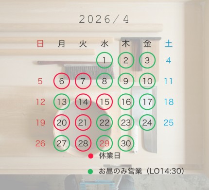 | 営業時間 | 昼11:00〜14:30/夜17:30〜22:00 |